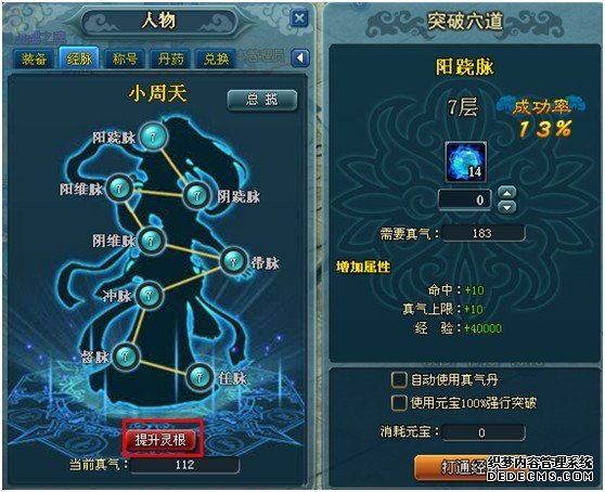 2. 提升经脉消耗真气,且有几率失败,每失败1次,增加1点成功率;